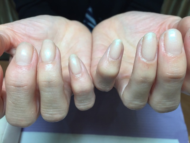 ベース1回目、爪の先が縮んでいる。短い爪でも、しっかり爪の先をファイルしておき、ジェルを塗るのが縮み防止になる。